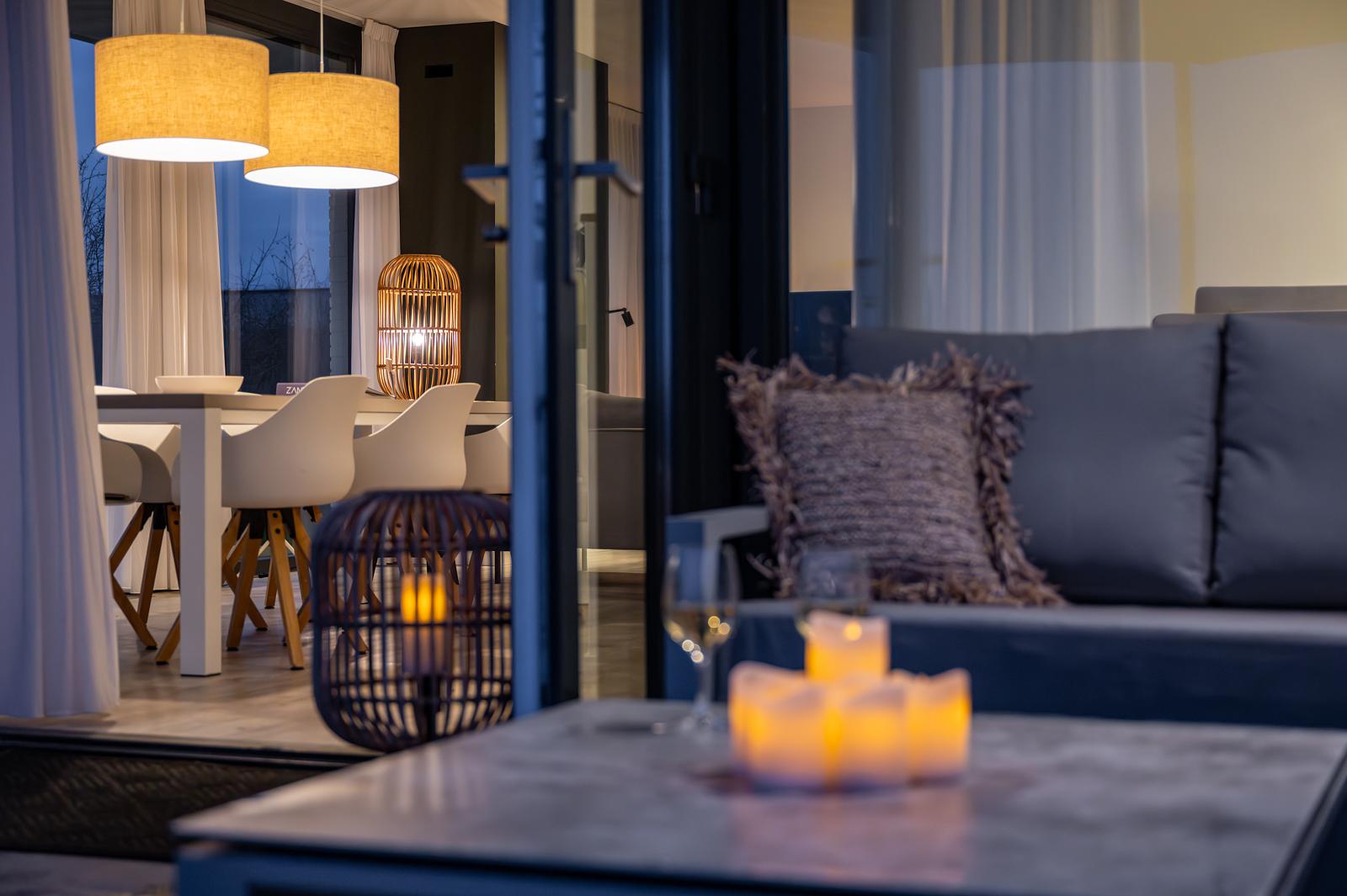 De in het duinlandschap gelegen designvilla’s liggen aan een waterpartij en hebben veelal een panoramisch uitzicht op het naastgelegen polderlandschap. De 4-, 6,- en 8 persoons villa’s zijn sfeervol en luxe ingericht en zijn allen voorzien van een gashaard. De wellness-villa’s beschikken over een Finse- of Infrarood sauna en/of buiten jacuzzi. Tevens zijn enkele vakantievilla’s voorzien van een laadpaal voor het opladen van elektrische auto’s.
